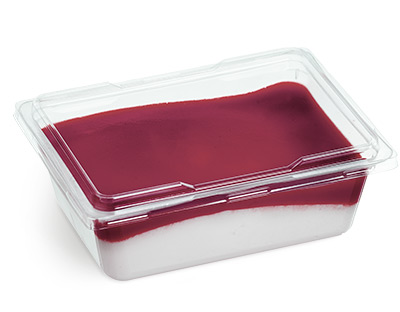 Petit pot en plastique polypropylène conditionné avec du film thermorétractable dans une pochette de carton