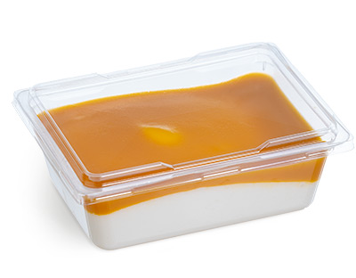 Petit pot en plastique polypropylène conditionné avec du film thermorétractable dans une pochette de carton